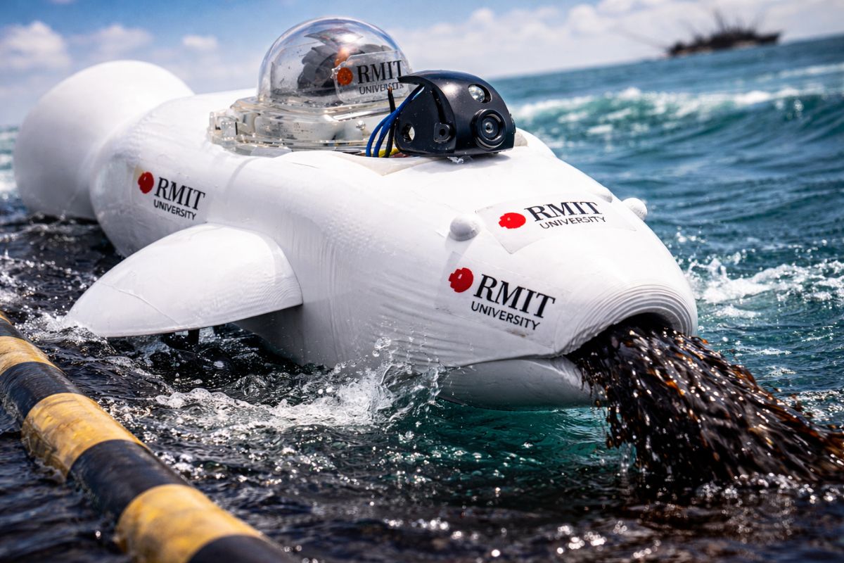 Australian engineers have created a robot dolphin that cleans oil from the ocean by absorbing oil and repelling water at the same time with over 95% purity, and they are now working on versions the size of a real dolphin to operate autonomously at sea.