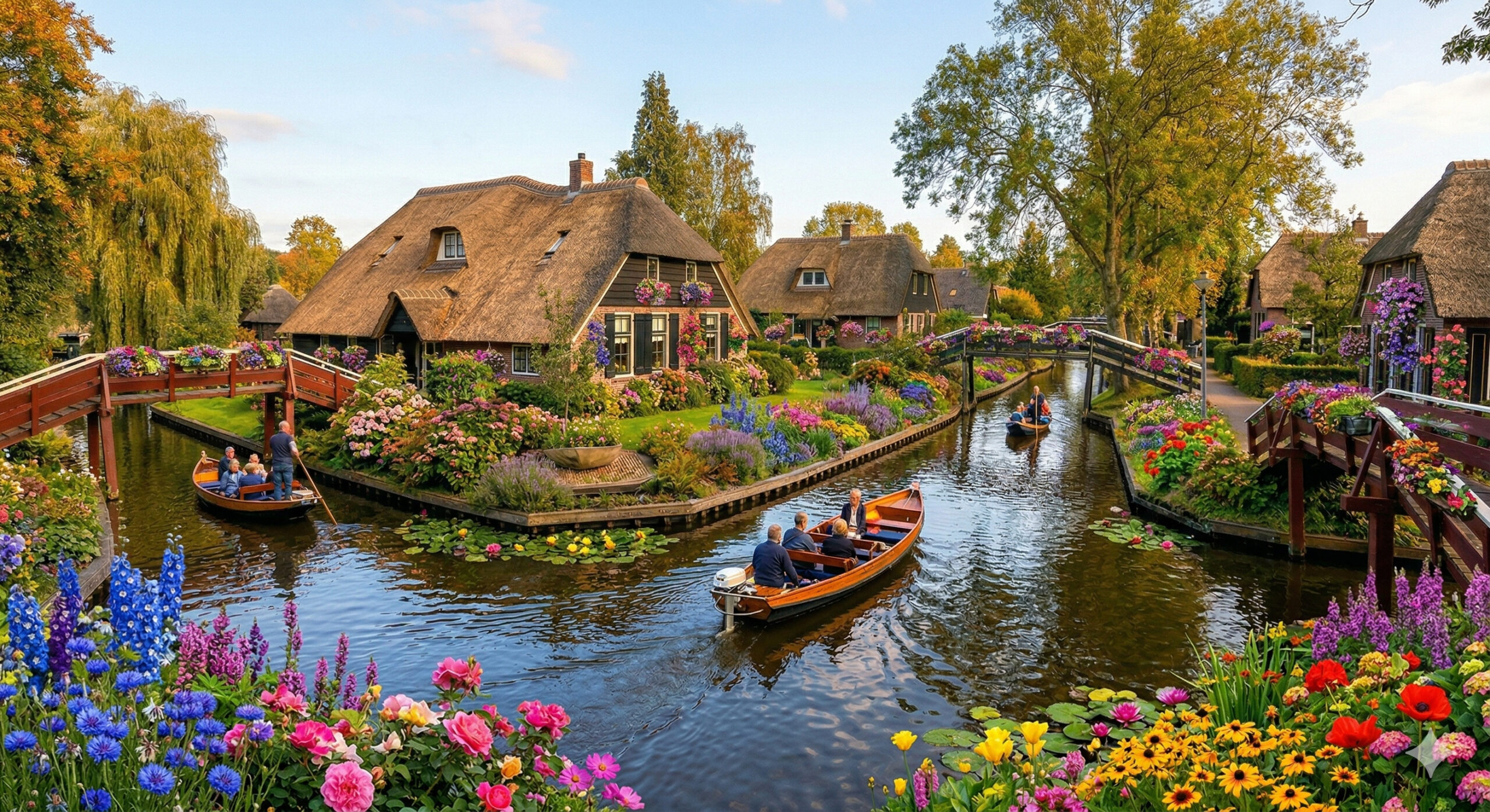 In the Netherlands, a village with nearly 3,000 residents has no streets: in Giethoorn, each house is located on an islet surrounded by canals, has thatched roofs that last up to 40 years, transportation is done by silent electric boats, more than 180 wooden bridges connect the properties, and the mailman delivers mail by boat because there is no other way to reach the doors.