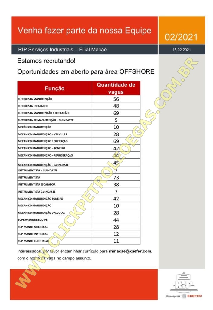 ATTENTION! Click Petroleum and Gas is not responsible for applications, the job openings for offshore work in Macaé posted below are external and may be filled at any moment by RIP Kaefer, so register your resume now!
