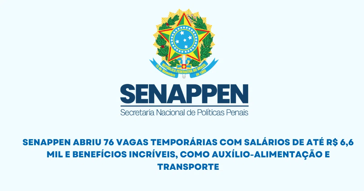 Don’t Miss This Chance! SENAPPEN Opened 76 Temporary Positions with Salaries Up to R$ 6,6 Thousand and Amazing Benefits, Such as Food and Transport Aid. Contracts for Up to 4 Years and Opportunities in Strategic Areas Such as Law and Administration. Sign Up by December 30 and Transform Your Career!