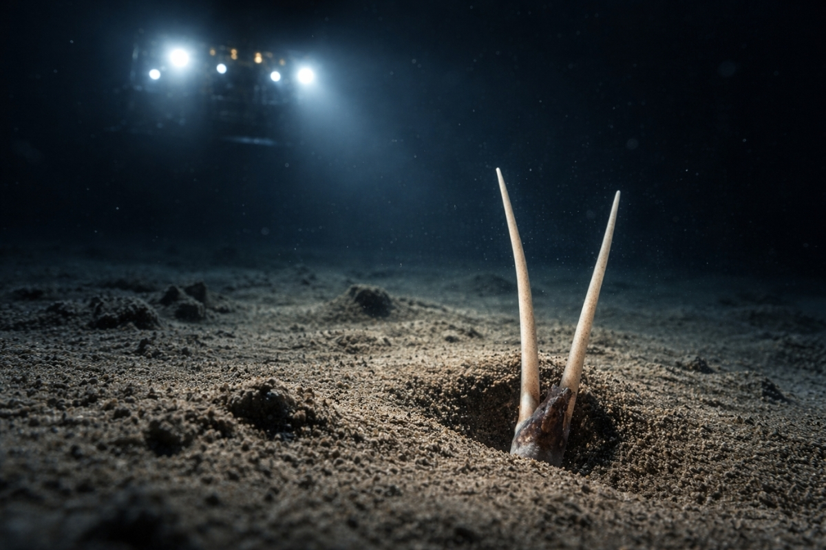 At a depth of 4,100 meters, a filming at the ocean floor recorded an unusual behavior: an unknown squid buried itself in the sediment, remaining almost completely hidden.
