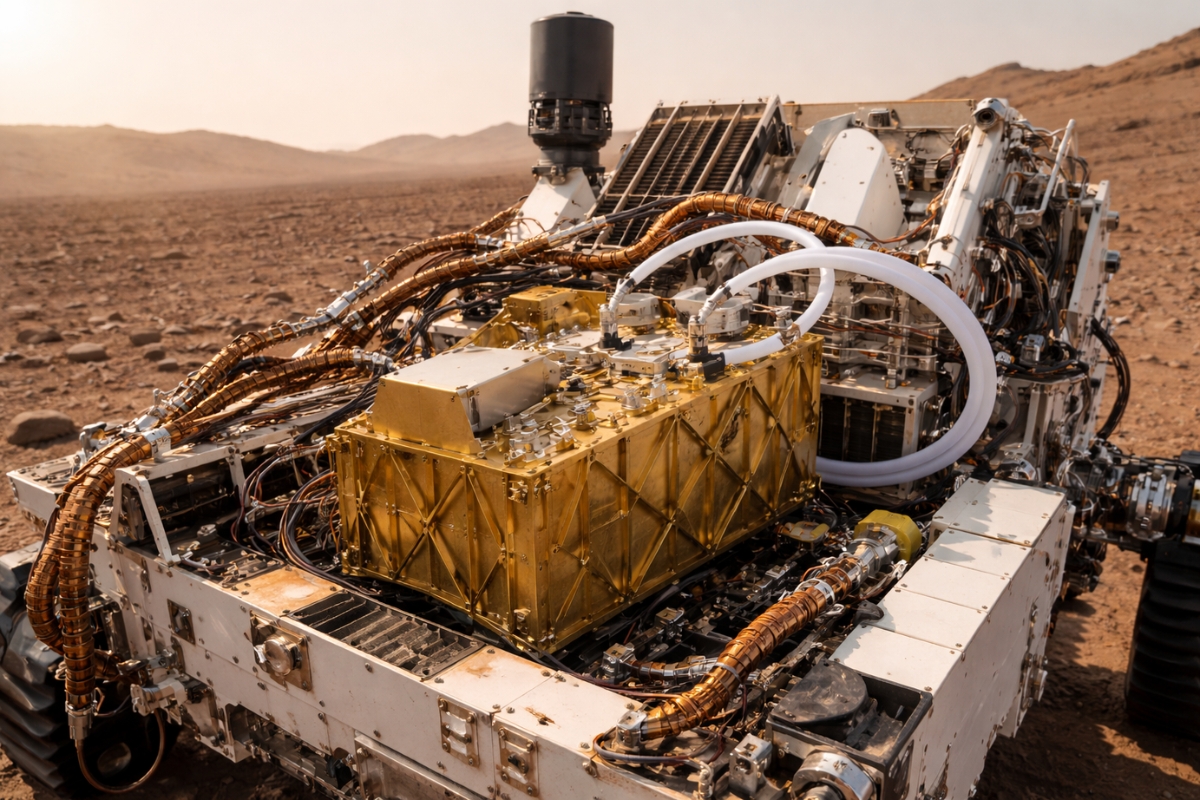 The instrument is called MOXIE (Mars Oxygen In-Situ Resource Utilization Experiment) and was sent to Mars aboard the Perseverance rover in 2020. Its goal was clear: to test whether it would be possible to produce oxygen directly on Mars from carbon dioxide (CO₂), which makes up about 95% of the Martian atmosphere.