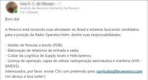After some time without news since acquiring some assets in shallow waters from Petrobras in November 2018, it seems that the British company Perenco will now start to kick off its oil and gas activities in Brazil, beginning with the Radio Operator position. It’s just one opportunity, but certainly a precedent for what is to come in the next weeks/months. See the announcement: