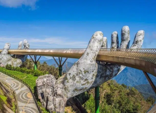 If you could walk on a bridge that seems to float among the clouds, supported by giant hands rising from the earth, wouldn’t that be amazing? In Vietnam, this dream has become a reality. The Golden Bridge, located in the Ba Na Hills resort near Da Nang, is considered the most beautiful bridge in the world. And for good reason! With its unique design and breathtaking views, this architectural masterpiece has captured the hearts of millions of tourists.