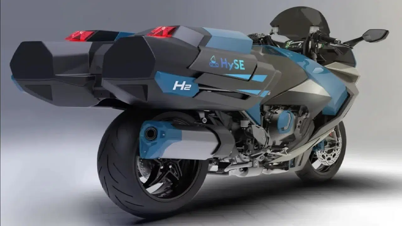 The acronym HySe, visible on the sides of the hydrogen-powered motorcycle, represents Hydrogen Small Mobility & Engine Technology, a partnership between Japanese giants Kawasaki, Honda, Yamaha, and Suzuki in the development of hydrogen engines for small vehicles.