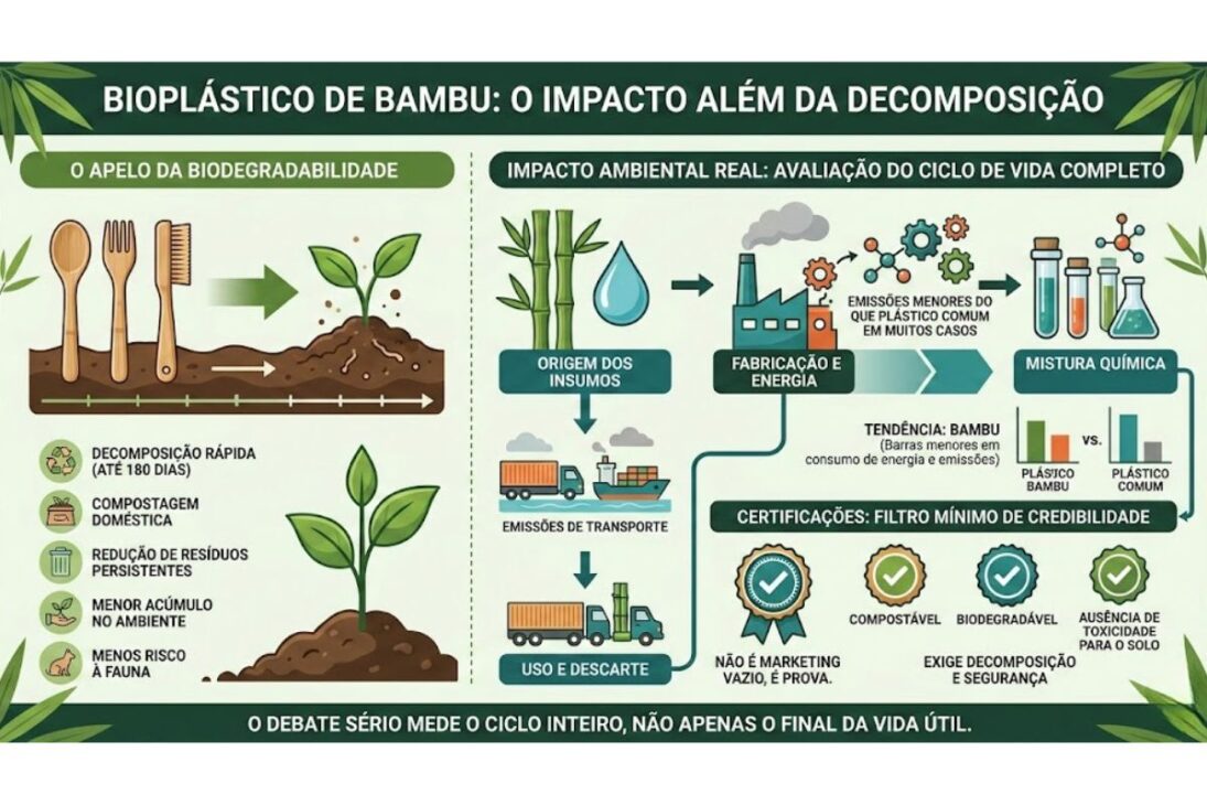 But biodegradability does not solve everything. The real environmental impact depends on a broader account, which includes energy consumed during manufacturing, the origin of inputs, the type of chemical mixture, logistics of transportation, and scale of use. A product may decompose relatively quickly and still have significant emissions during its production. Thus, the comparison with common plastic cannot be limited to disposal. The serious debate begins when the entire cycle is measured, not just the end of the useful life.
