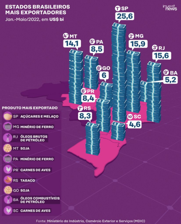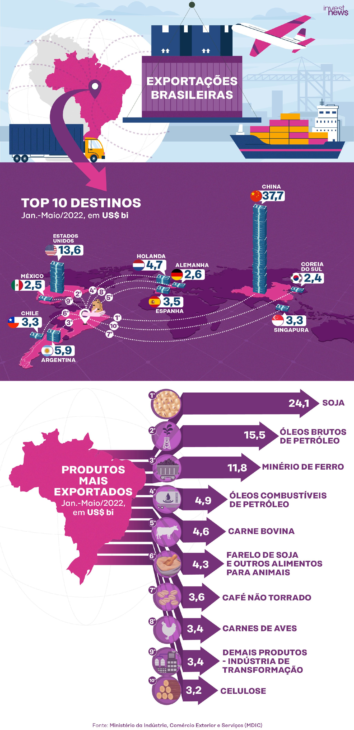 Iron ore saw a drop of 35.55% after peaks last year due to low mining productivity. According to data shared by the federal government, it is estimated that between January and May, the export value exceeded US$ 11 billion. Following the metal, which benefits the mining sector, is beef, primarily exported to South American countries, which reached US$ 4 billion in negotiations.