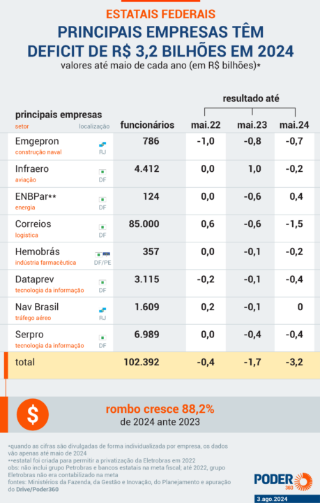 On the other hand, seven of the main state-owned companies reported deficits by May 2024. Correios, for example, faced a shortfall of R$ 1.5 billion, worsening by almost R$ 900 million compared to the same period in 2023. Emgepron, responsible for naval projects, also had a significant negative balance of R$ 651.3 million.