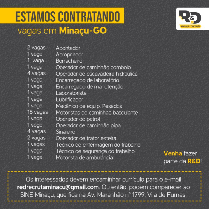 R&D MINING AND CONSTRUCTION wins contract in Minaçu-GO and calls for many positions in elementary, high school, and technical education. There are job openings for Helper, Operator, Driver, Mechanic, Supervisor, Technician, and more, check below for all the positions called and how to register your resume.