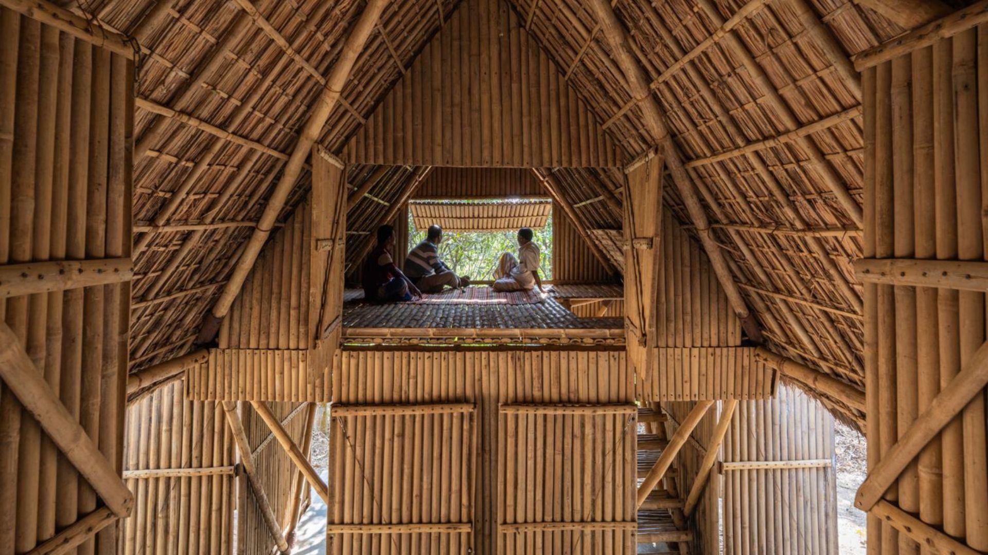 The configuration of Khudi Bari utilizes structural bamboo combined with metal connectors, forming a lightweight and rigid set, described in the project documents as a spatial structure capable of efficiently distributing loads.