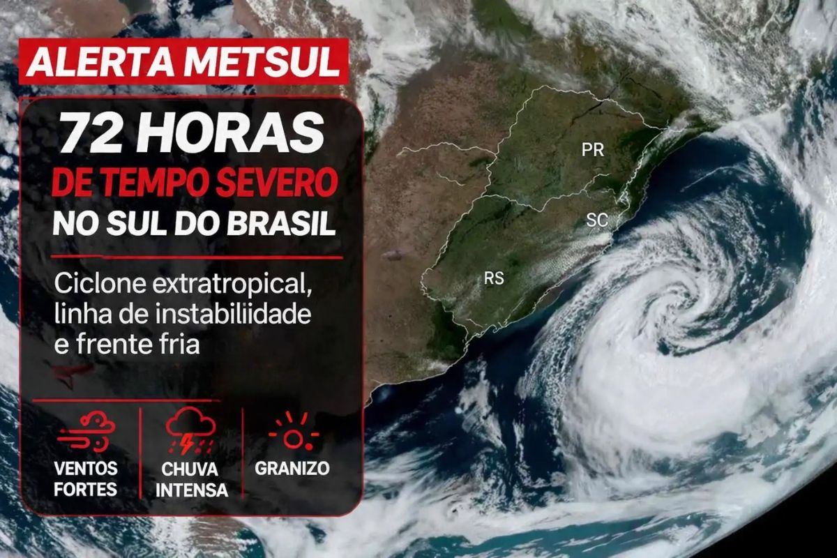 MetSul issues alert for 72 hours of severe weather in the South of Brazil with an extratropical cyclone, a line of instability, and a cold front that will hit Rio Grande do Sul from Monday to Wednesday with strong winds and heavy rain.