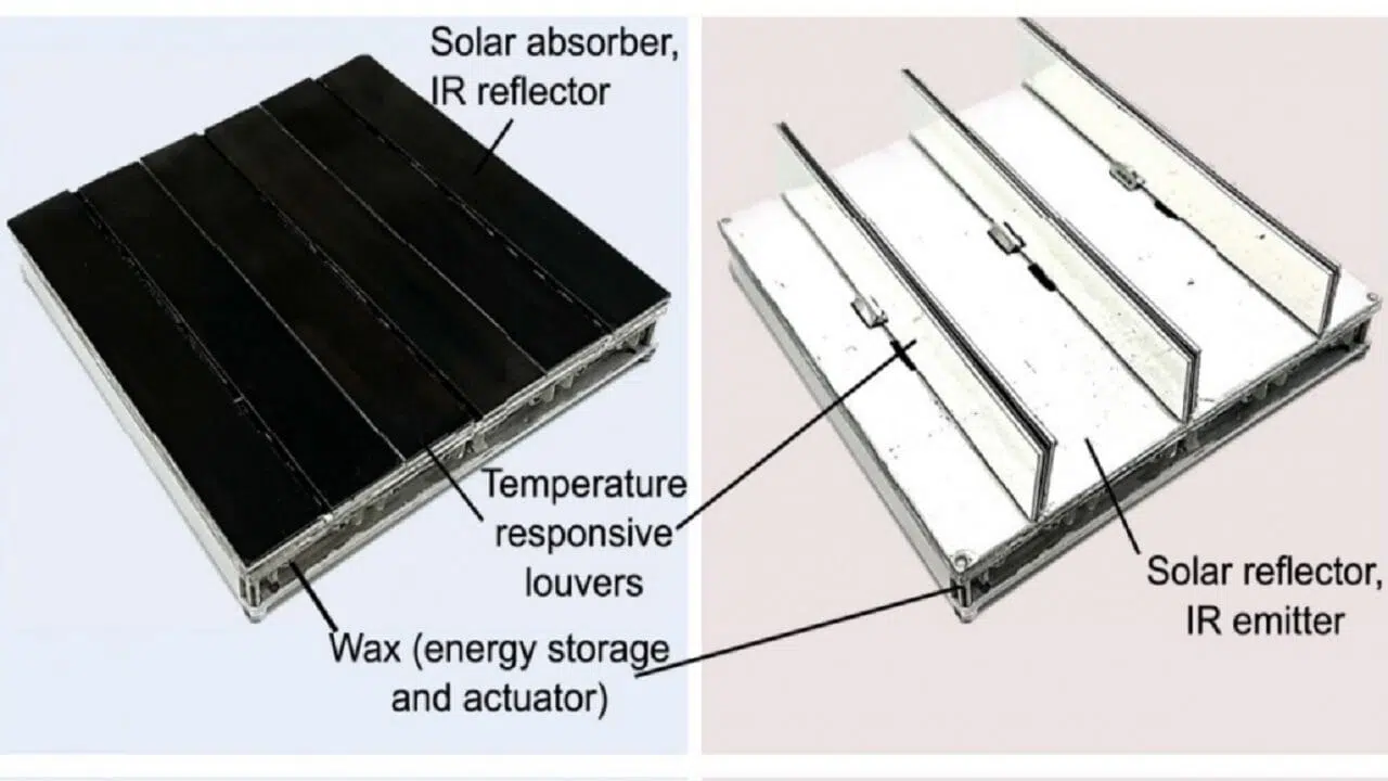 Thus, at cooler temperatures, while the wax is solid, the blinds are closed and flat, exposing a surface that absorbs sunlight and minimizes heat dissipation through radiation. But as temperatures reach around 18 °C, the wax begins to melt and expand, opening the blinds and exposing a surface that reflects sunlight and emits heat.