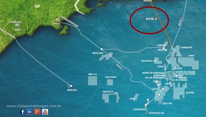 Another important tender currently at stake is the construction of the last 10km of submarine pipelines of route 3, which will connect COMPERJ to the pre-salt in the Santos Basin. This work is important for us to be able to transport all Brazilian production; otherwise, the production will be reduced and a lot of excess gas will be burned, and that is losing money, literally. See in the image below where the pipeline comes from.