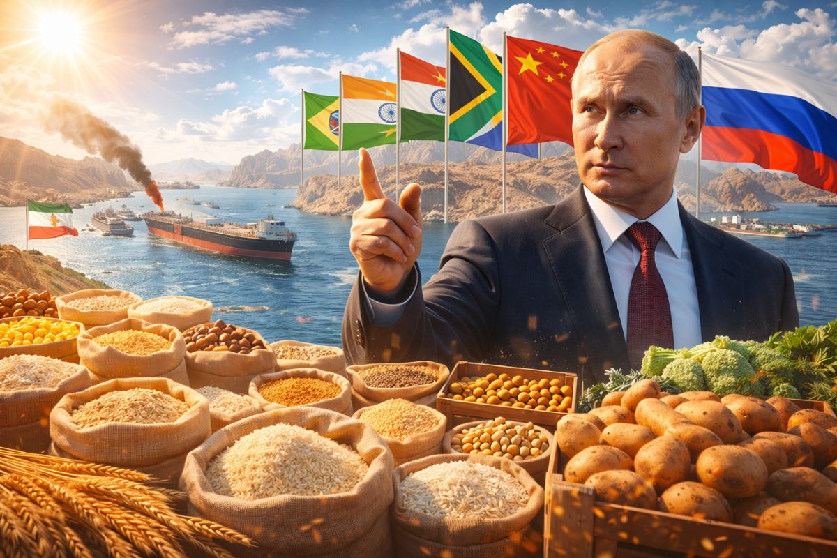 Russia pressures BRICS for joint food reserves after the crisis in Iran closed Hormuz, threatening fertilizers and halving productivity; warning indicates inflation and hunger affecting 673 million people.