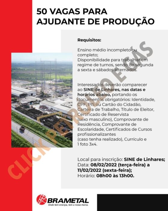 Application: Those interested in applying for the job openings for the position of Production Assistant, opened by Brametal, should submit their resume in person to SINE Linhares by February 11, 2022, from 8 AM to 1 PM, bringing the following documents: