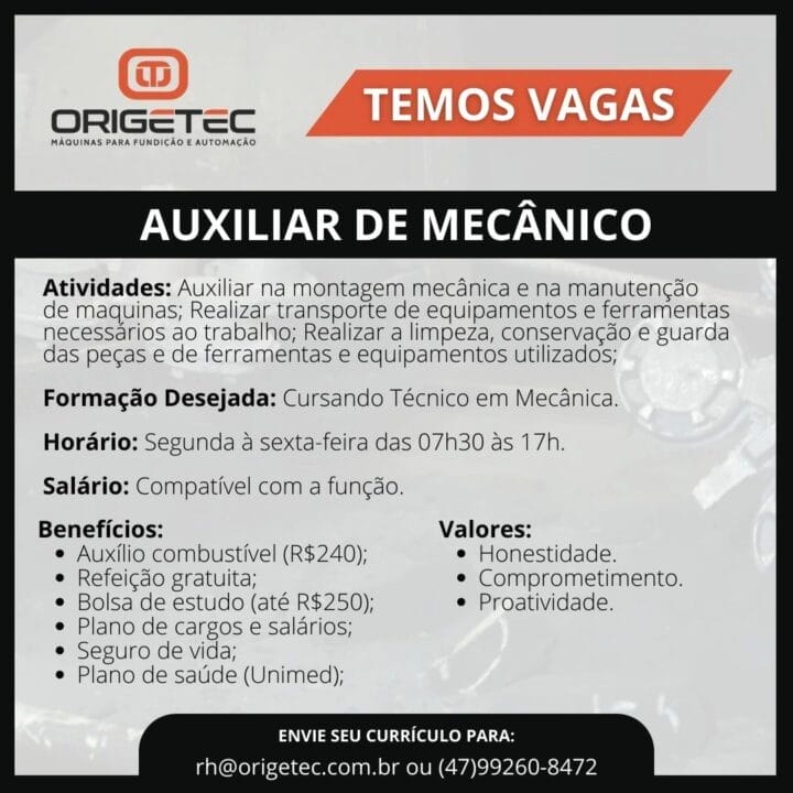 Among the activities, the professional will assist in mechanical assembly and machine maintenance, transport necessary equipment and tools for the job, and take care of the cleaning, conservation, and storage of the parts, tools, and equipment used. The desired qualification is currently pursuing a Technician in Mechanics.