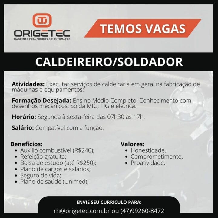 The professional will perform general boiler services in the manufacturing of machines and equipment. It is necessary to have a complete High School education, knowledge of mechanical drawings, and experience with MIG, TIG, and electric welding.