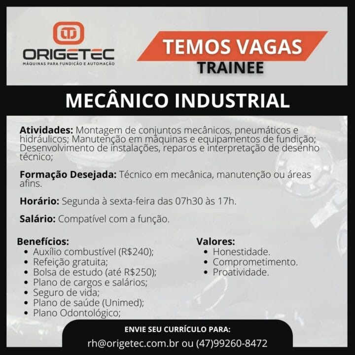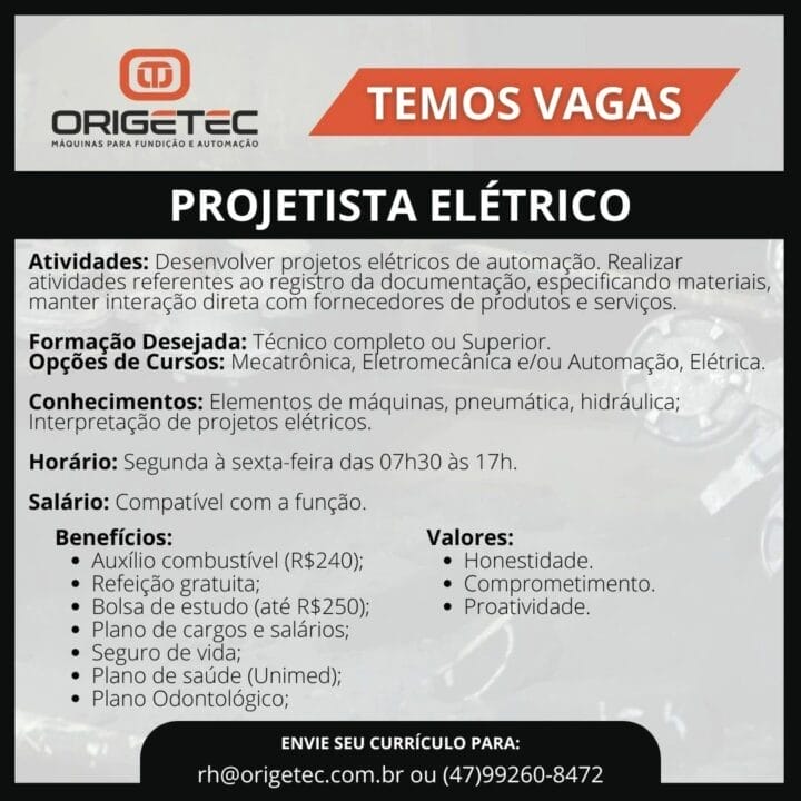 ORIGETEC, a leading company in the manufacture of machines for foundry and automation, is expanding and seeking dedicated and proactive professionals to join its team. If you are looking for professional growth and want to work in a dynamic and innovative environment, check out the available positions announced this week and send us your resume!