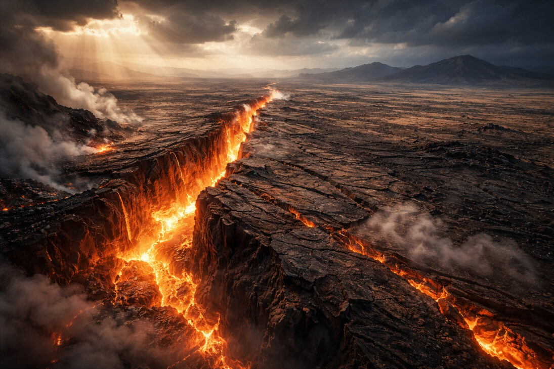 In September 2005, residents of the Afar Desert in northeastern Ethiopia woke up to shaking ground, air darkened by volcanic ash, and the sound of cracks opening in the earth. In just ten days, a fissure about 60 kilometers long tore through the region’s surface. The ground even separated by up to 8 meters in less than two weeks. Under normal tectonic drift conditions, a shift of this magnitude would take several centuries to occur.