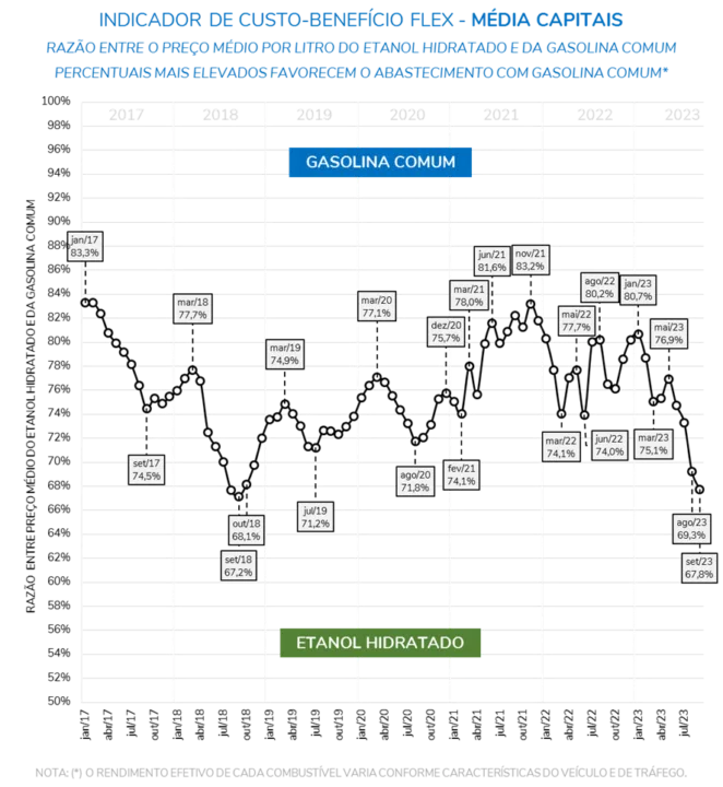 With the constant increases in gasoline prices, ethanol emerges as a more economical alternative for flex vehicles. Throughout 2023, while regular gasoline saw a 15.9% increase in its average price, ethanol experienced a reduction of 4.3%. This resulted in ethanol costing only 68.4% of the value of gasoline, a ratio not seen since October 2018.