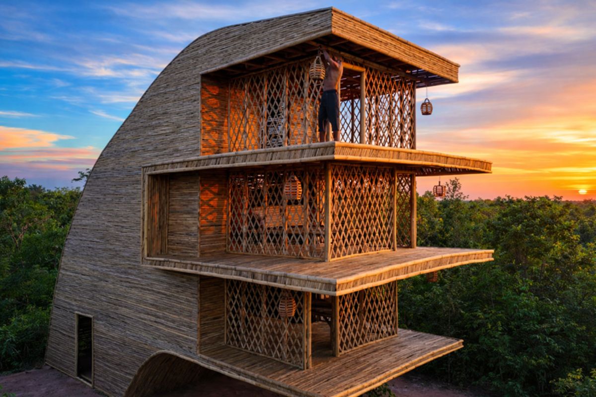 This construction draws attention because it shows, in practice, that a 3-Story Bamboo House can be elevated, enclosed, and functional when there is a clear structural logic and careful execution.