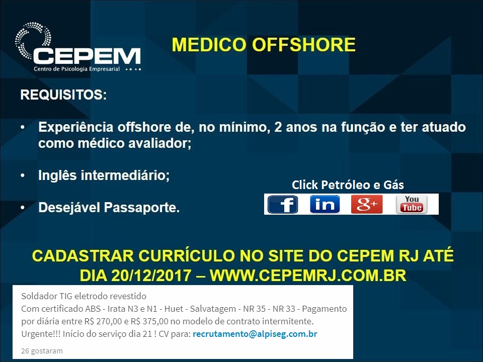 - Area Men, Platform Workers, Doctors, and Roustabouts – Must have at least 4 years of experience in drilling rig roles, intermediate English, and preferably a passport. To apply, it is necessary to go to the site http://www.cepemrj.com.br/site/curriculos FROM A COMPUTER and register your resume.