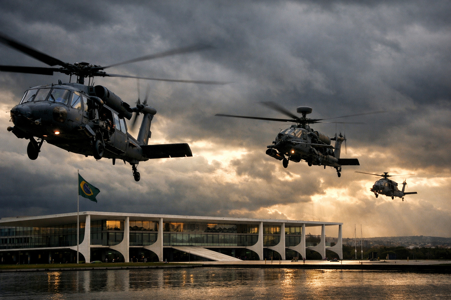 Military helicopters fly over Brasília in a visual simulation representing a hypothetical scenario of geopolitical tension and reigniting the debate about Brazil’s sovereignty and defense capability. Credits: Illustrative image created by AI – editorial use.