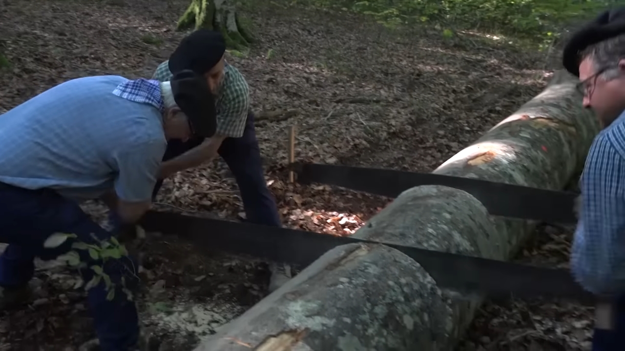 The heavy work begins at the base of the giant trees in the Spanish mountainous region. The artisans use a huge saw operated by two people to separate the raw wood into precise slices of 65 centimeters in length.