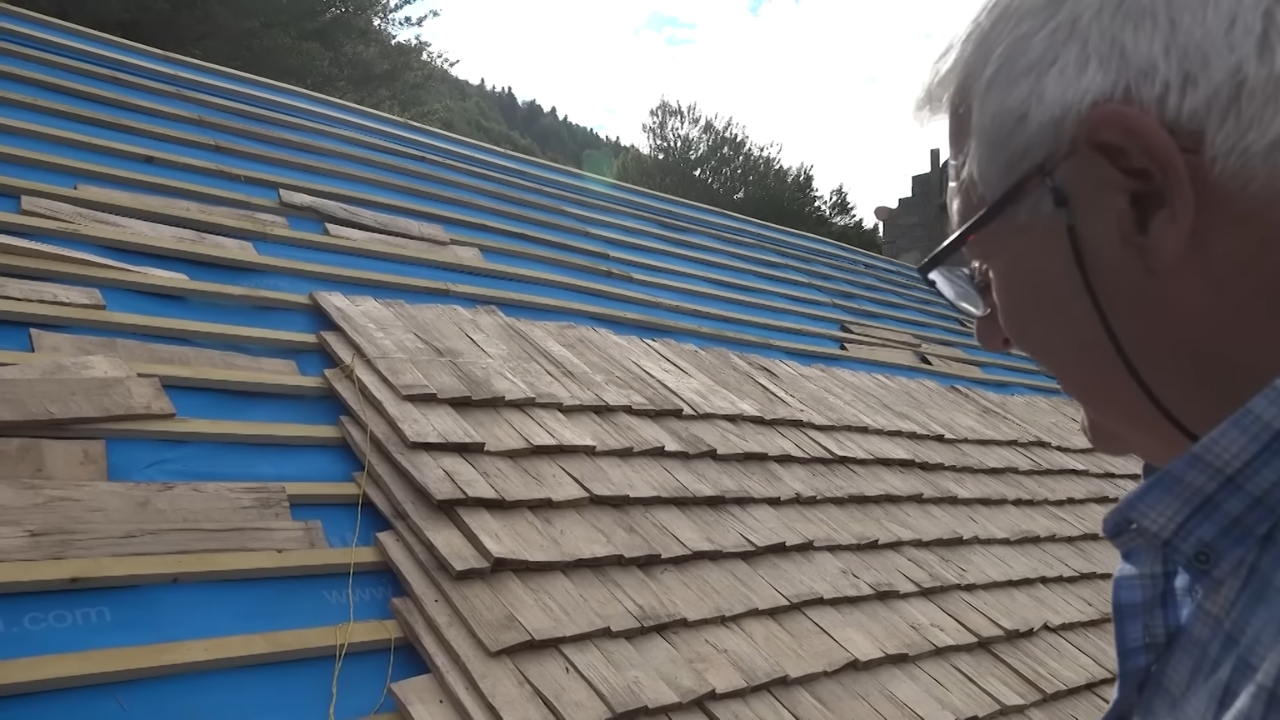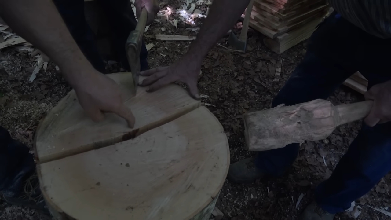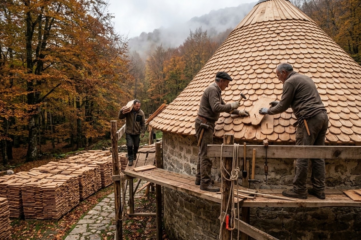 A group of experienced workers entered the forest to produce from scratch all the material needed for the new roof. The team used only human strength and heavy manual tools to slice massive logs and create thousands of pieces with a completely analog technique.