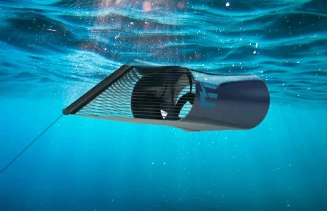 The mini turbine features three blades of approximately 1 meter in diameter, connected to an electric generator to take advantage of wave motion.