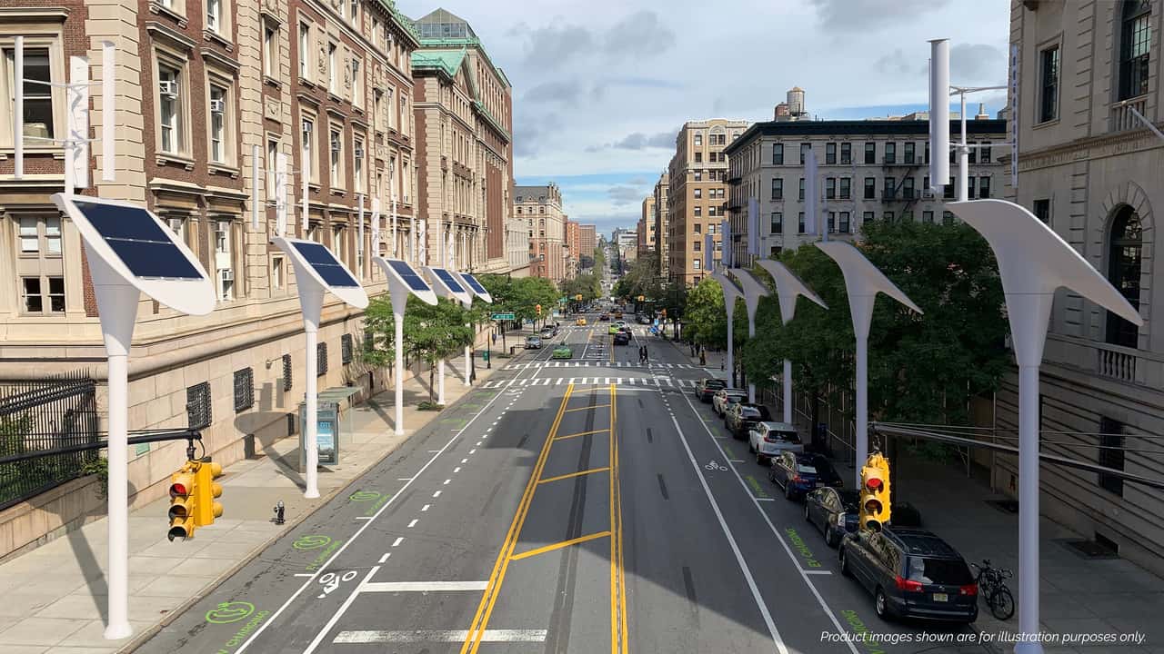 The BeamSpot system combines solar and wind energy with electricity supplied by utilities, storing energy in patented batteries. The goal is to provide not only public lighting but also charge electric vehicles directly on the sidewalk, without the need for significant changes to existing urban infrastructure.