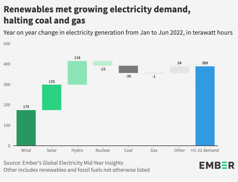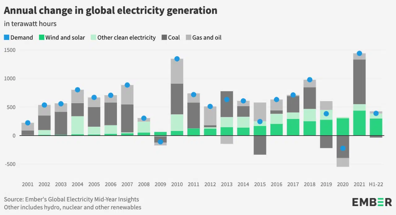 A report in the UK from the energy think tank Ember to be published on Wednesday (5) will show that renewable energies covered all the growth in global electricity demand in the first half of 2022, preventing any growth in electricity generation from coal and gas.