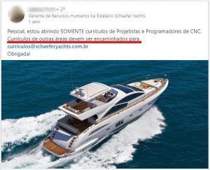 The shipyard managers inform that they are not opening messages for an area different from the ones listed above for now, but if you have already worked in the nautical and yacht sector, please send your resumes identifying in the subject the name of the position held. The email for sending resumes is curriculos@schaeferyachts.com.br, please indicate in the subjectCNC PROGRAMMER or DESIGNER.
