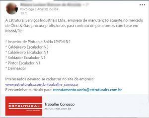 It has been a while since Estrutural Serviços Industriais has made any announcements regarding news and job openings in the offshore sector. The last major service contract they secured, which we found out about, was for the REDUC (Refinaria Duque de Caixas) works along with the company Perbras in July, since then we haven’t heard anything else about the company, but that just changed today! They announced another offshore selection process in Macaé yesterday (6), check it out below: