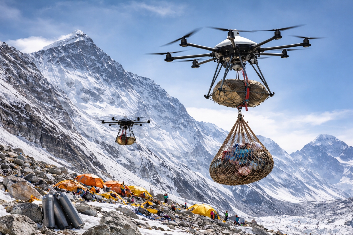 The change gained momentum after a successful delivery on Everest in 2024 with the transportation of three oxygen bottles and more than 1.5 kilograms of supplies to Camp 1. That phase opened the door for more continuous use in the following year.