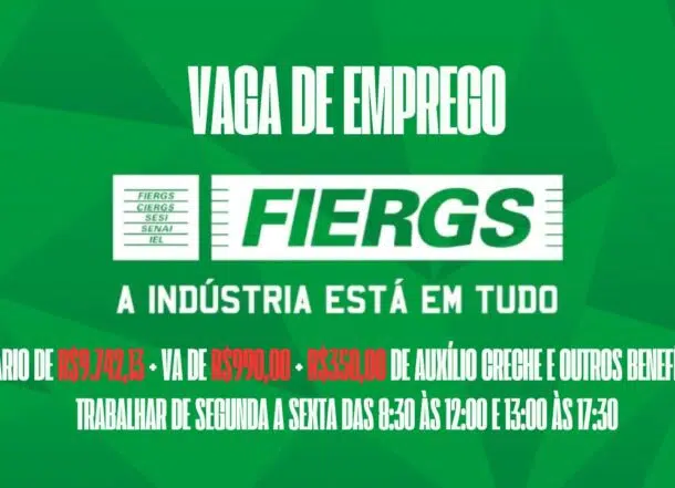 FIERGS anuncia vaga de emprego com salário de R$9.742,13 + VA de R$990,00 + R$350,00 de auxílio creche e outros benefícios, para interessados em trabalhar de segunda a sexta das 8:30 às 12:00 e 13:00 às 17:30: Veja como garantir a vaga de analista corporativo