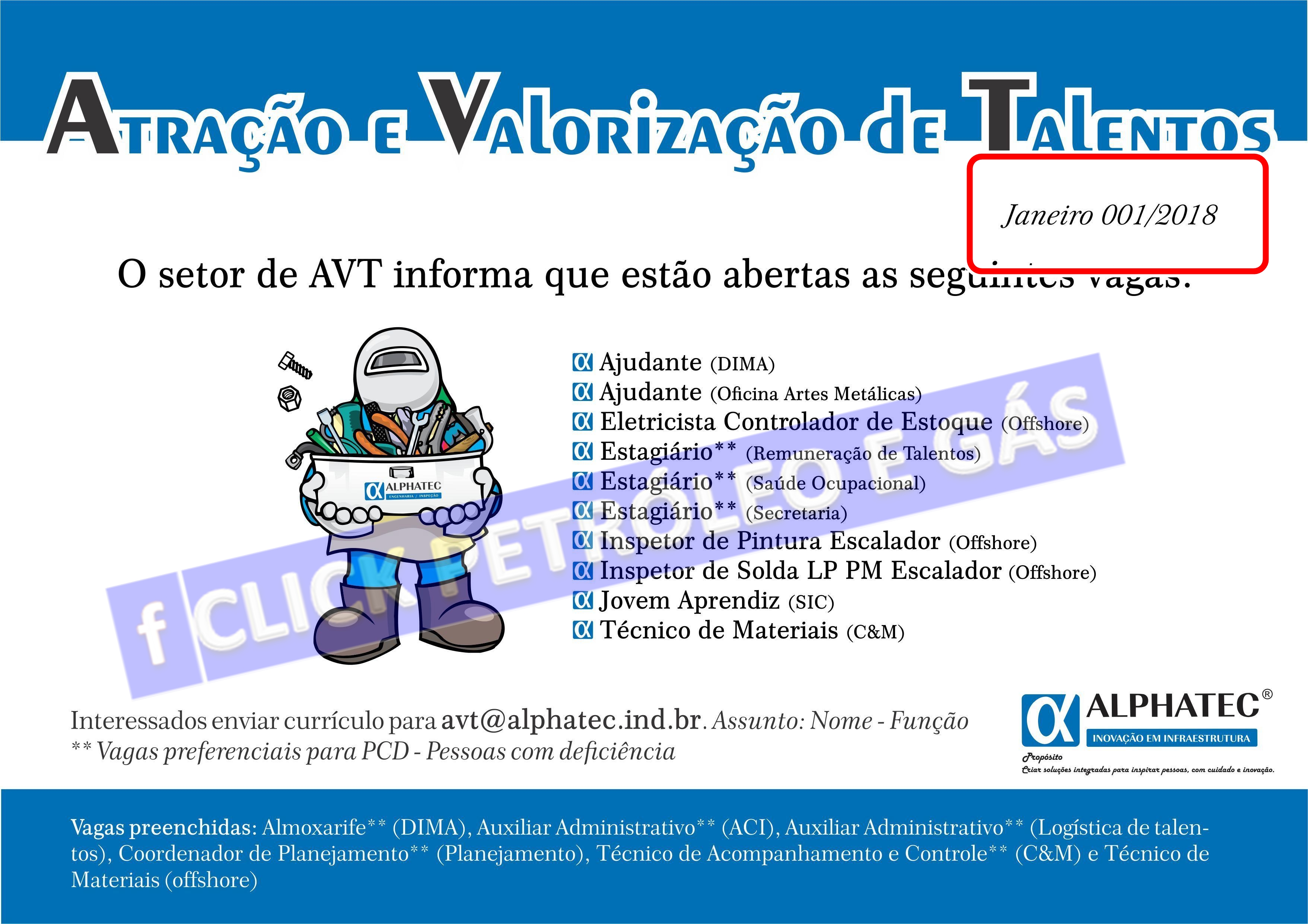 The hiring company is called Alphatec Engenharia and to apply for the positions listed above, you should send an email to avt@alphatec.ind.br. It is necessary to inform your NAME and POSITION in the subject field of the email, so the company can identify you according to the available positions, avoiding that your contact is discarded right from the start. See the company’s post here.