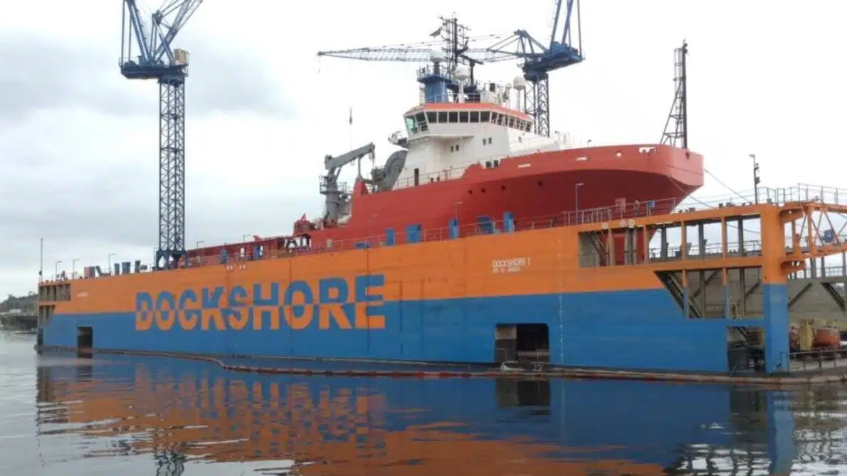 For those unfamiliar, a floating dock is a structure mainly used for ship repairs and maintenance. It works like a portable dry dock, allowing vessels to be lifted out of the water for inspections, repairs, and painting that cannot be performed while the ship is submerged. Additionally, the floating dock is also used to launch ships into the water safely and in a controlled manner.