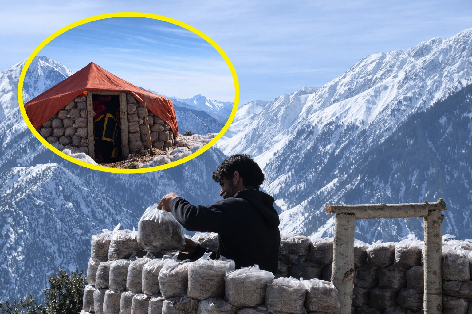 Man Builds Shelter With Plastic Bags to Hold Soil and Survive Cold and Snow, Challenging Traditional Building Methods in Freezing Environments
