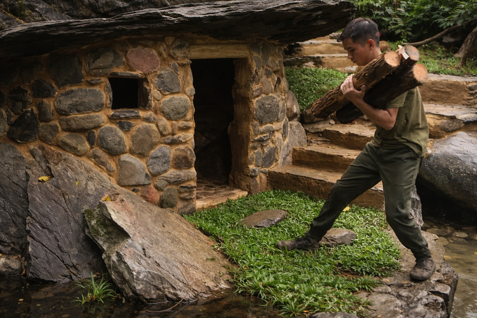 The home hidden beneath stone draws less attention in the rocky and green terrain. What often reveals improvised constructions is contrast, and this phase works precisely to reduce that.
