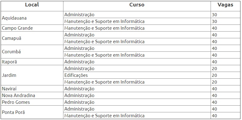 The IFMS – Federal Institute of Mato Grosso do Sul published on this Monday, April 22, the announcement no. 032/2019 for the selection process to fill 560 spots in the institution’s distance technical courses in 10 cities. The opportunities are for technical courses in Administration, Civil Engineering, and Maintenance and Support in Information Technology, in the municipalities of Aquidauana, Campo Grande, Camapuã, Corumbá, Itaporã, Jardim, Naviraí, Nova Andradina, Pedro Gomes, and Ponta Porã.