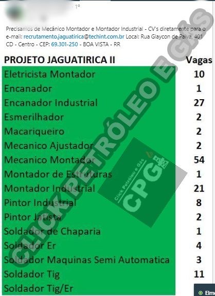 “We need Assembly Mechanic and Industrial Assembler – CV’s directly to the email: recrutamento.jaguatirica@techint.com.br “. Continuing the sentence, referring to the other positions listed above: