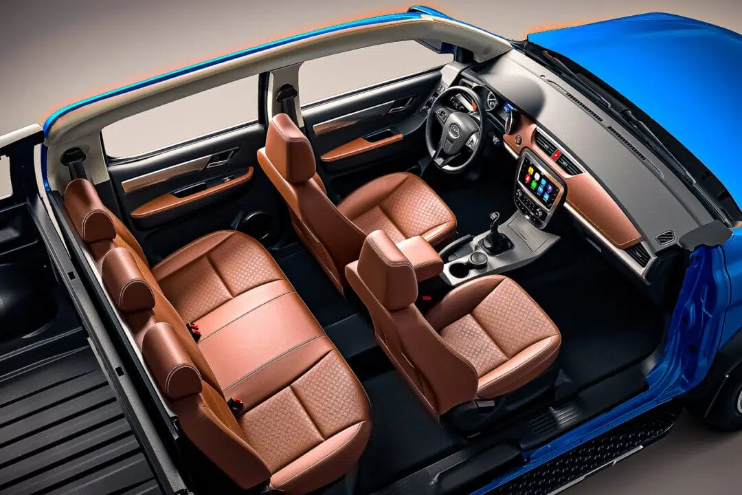Talking a bit about dimensions, the pickup measures 5.33 m in length (the same length as the rival Toyota Hilux), with a wheelbase of 3.10 m, 1.96 m in width, and 1.93 m in height, weighing a light 1976 kg and it can accommodate up to 1090 L of luggage in the bed and at least 900 kg in the Chinese configuration, which is only gasoline, but in the versions with turbo diesel engine, it has a capacity of 1 ton and 50 kg.