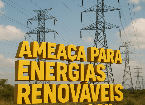 Torres de transmissão de energia sob céu azul com a frase em 3D "Ameaça para energias renováveis no Brasil" em destaque.