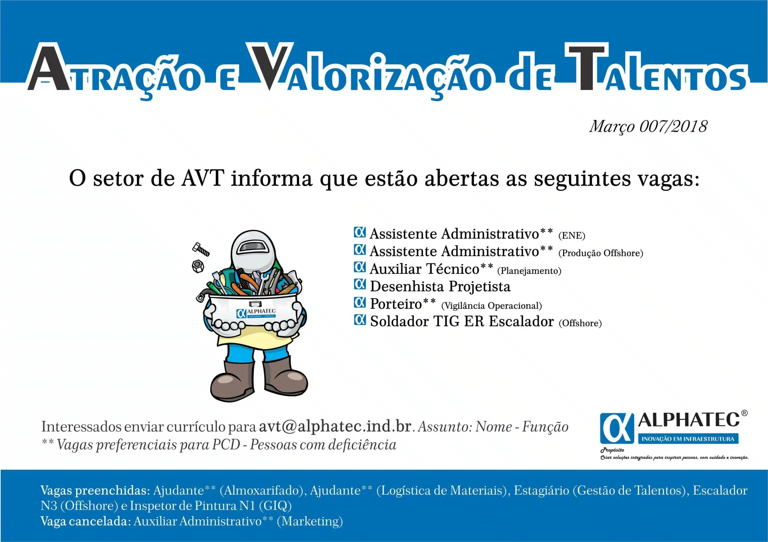 Interested candidates within the role should send their resumes to avt@alphatec.ind.br, stating the job title in the subject line and remembering that the positions are also open to People with Special Needs. Please note that the vacancies for Warehouse Keeper, Helpers, Interns, N2 Climbers, and Painting Inspectors have already been filled, so there is no need to apply for these positions at this time.