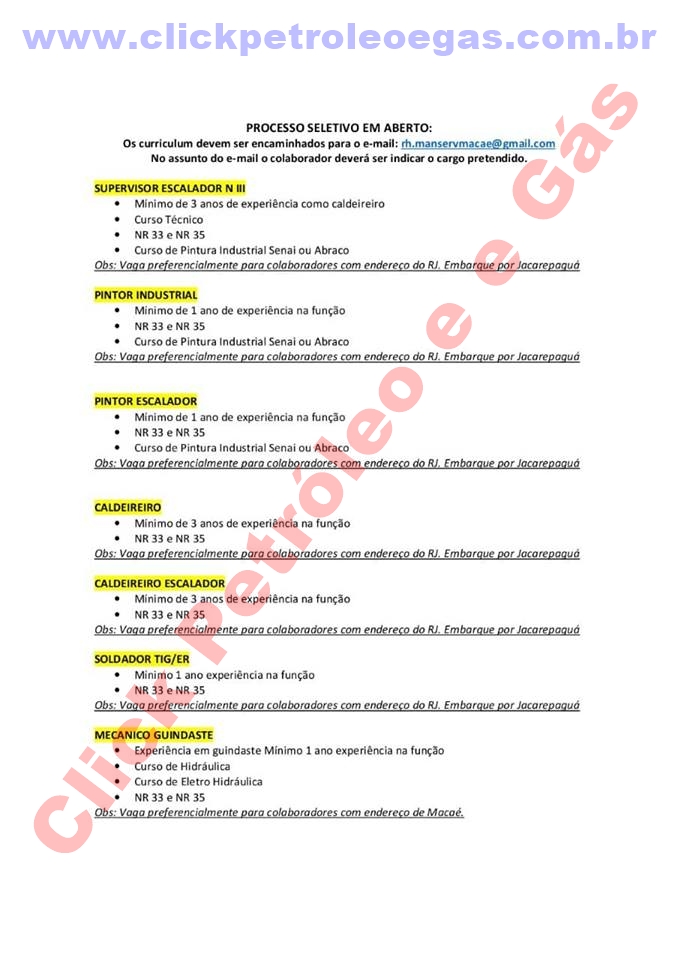 Manserv has just announced new hires for specific positions to support its operations in Rio de Janeiro. Click Petroleum and Gas was requested to publicize these opportunities and make the forwarding through this article. We ask everyone to strictly follow the requirements provided for each role, as they are contractual terms of the client (PETROBRAS), so there is no possibility of negotiation beyond what is being requested. See below the HR request to our portal today (06):