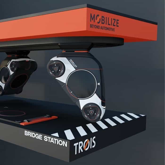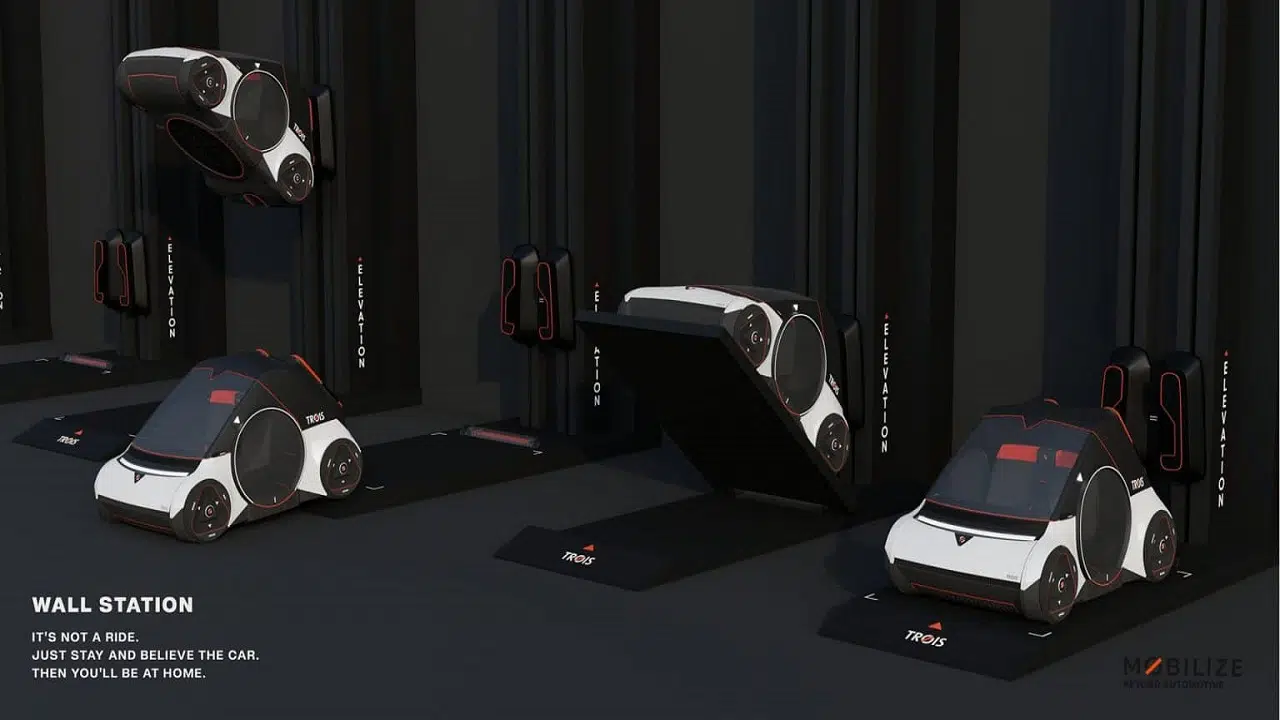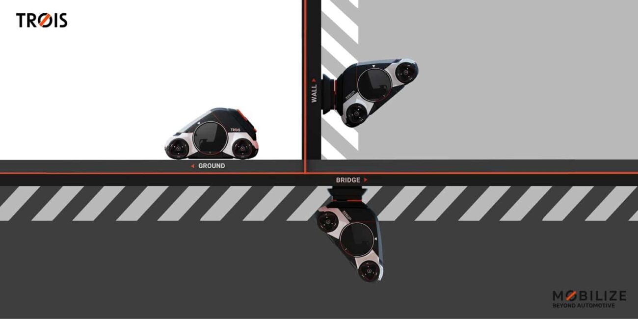 The anchoring platforms help the electric mini car climb walls or under bridges, functioning like a kind of wheelchair elevator, where Trois attaches to the surface it needs to climb.