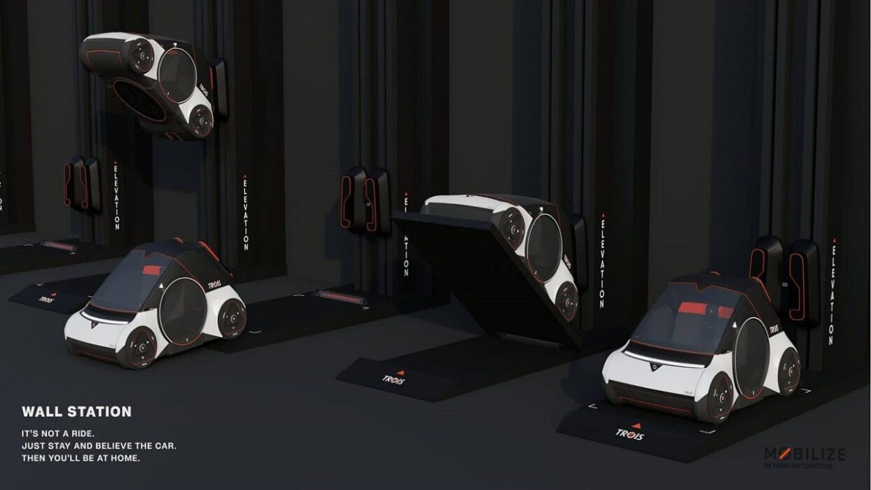 The electric car of the future is called Trois, which means “three” in French, and the name was chosen very intentionally, as the mini car can switch between three modes of driving: ground, wall, and bridge. To be able to climb and descend walls and under bridges, Trois uses magnetic energy.