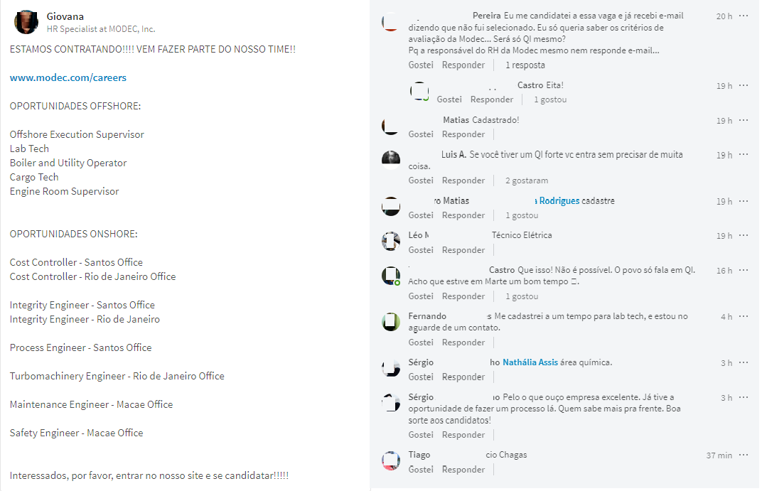 Despite the Human Resources personnel of Modec calling on professionals on social media, as you can clearly see in the photo below, many professionals (as they claim to be) enter the company’s post profile to SPEAK ILL OF THE COMPANY! Do you think it’s a lie? See the screenshot below. If it’s already ugly to speak ill of companies everywhere, imagine entering their recruitment site and saying these things. It’s professional suicide!