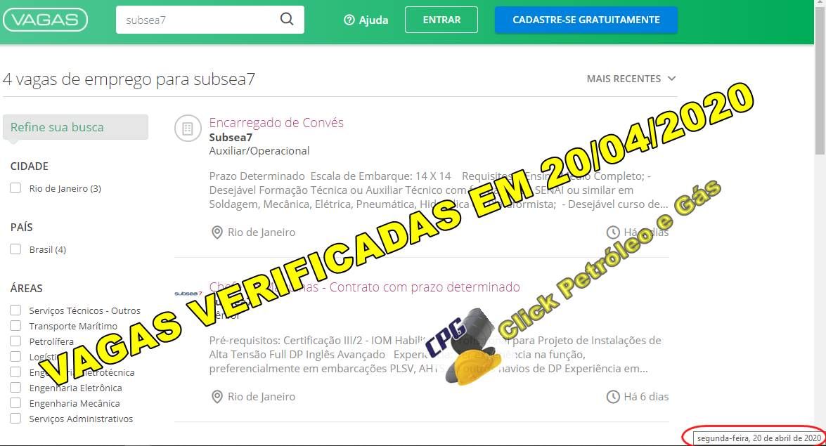 ATTENTION! Click Oil and Gas is not responsible for applications; the offshore positions in Rio de Janeiro to work at Subsea 7 are external and may expire at any moment